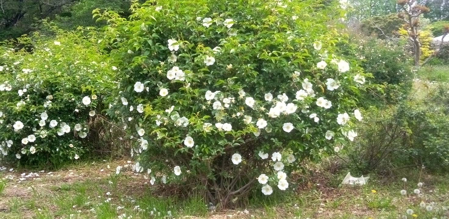 公園の散歩途中、奥の方にこんもり丸く白い花が咲いている!