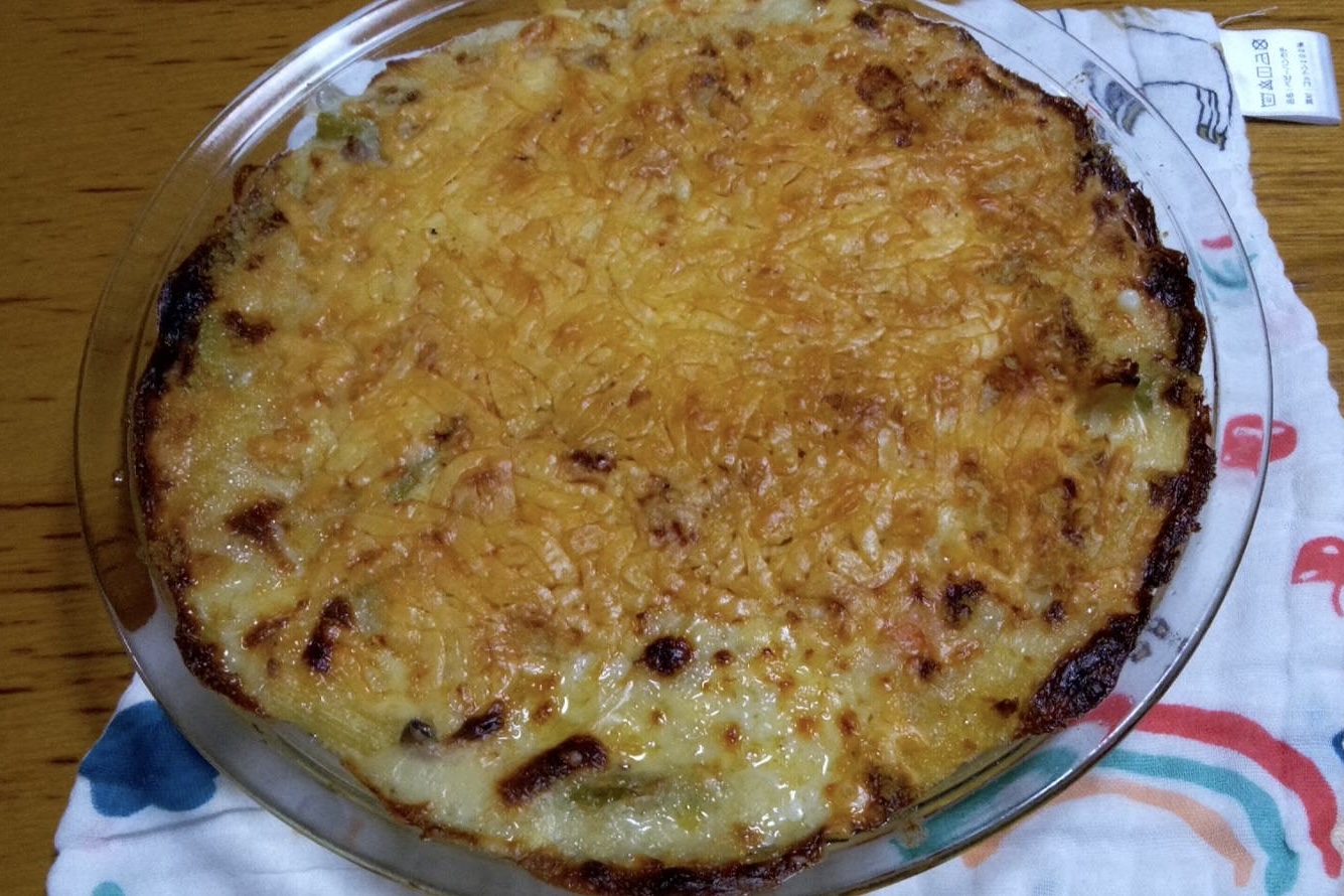 焼き色をしっかりつくように、チーズたっぷり、広く浅いパイ皿で焼いた。