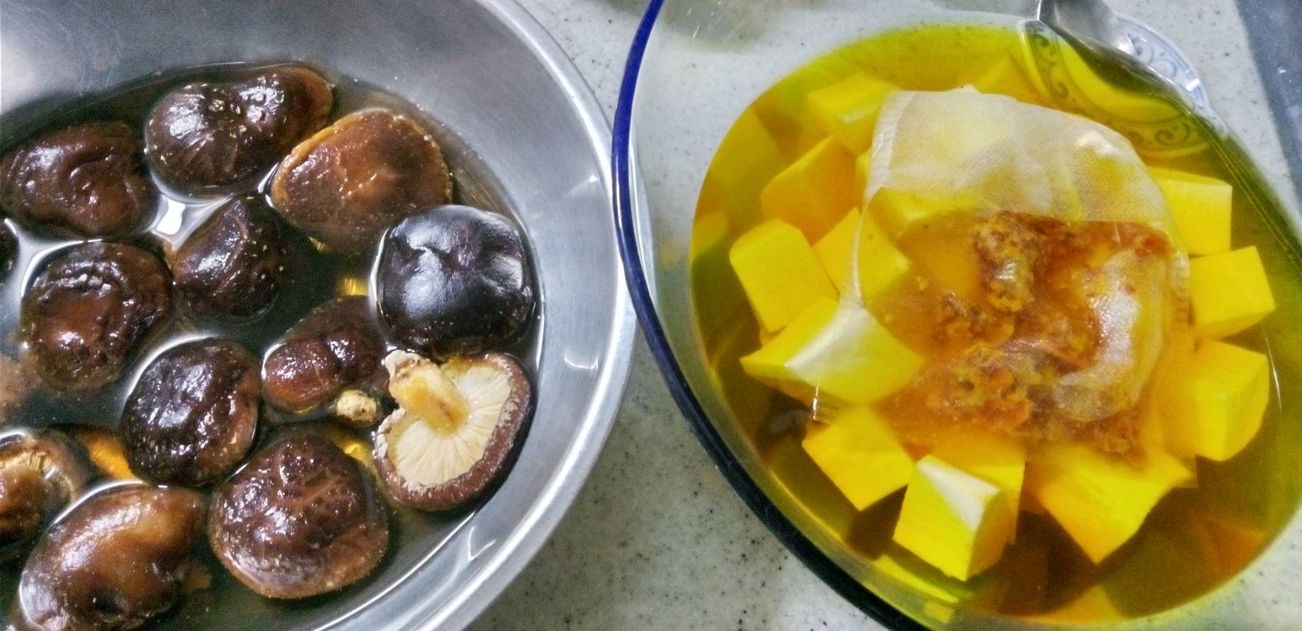 干し椎茸を戻し、さつま芋はクチナシの実に浸けておく。