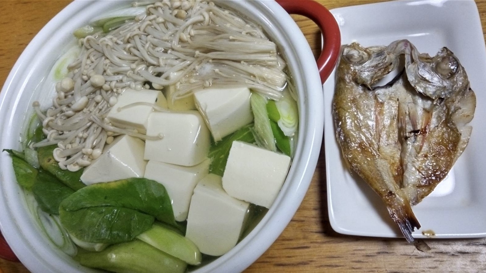 夕食、頂き物のノドグロの干物、簡単な湯豆腐、ノドグロ美味しかった!