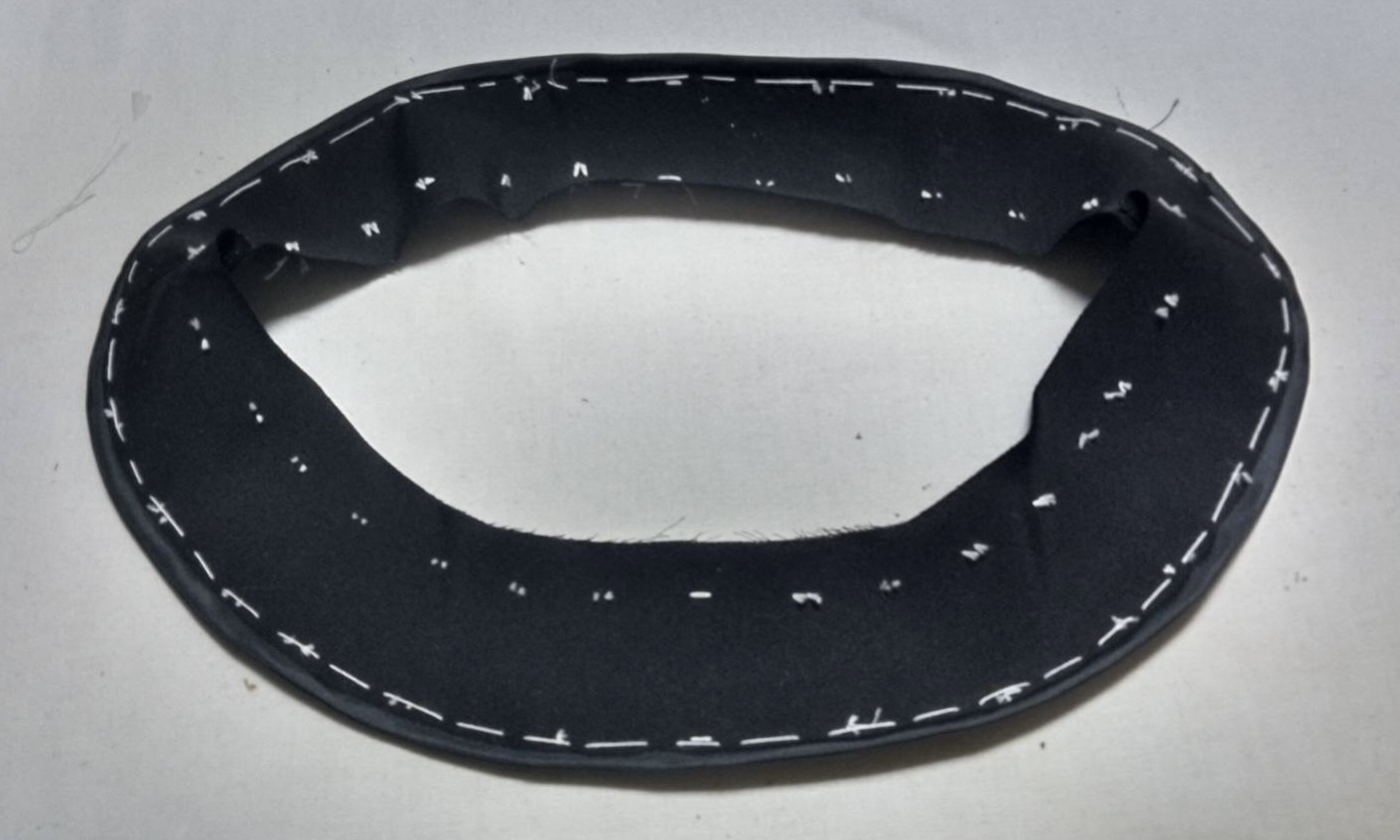 衿ぐりの見返しの端、裏布でくるむパイピング処理にした。